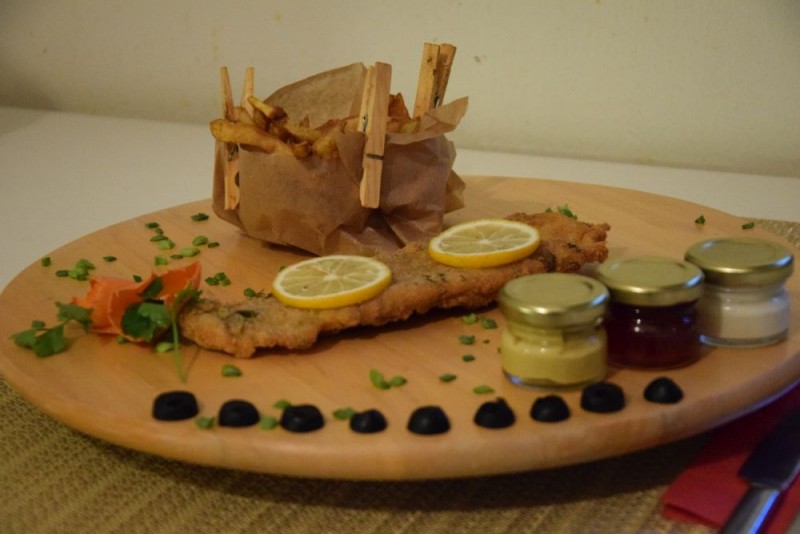Cod pane cu cartofi natur, salata de varza si lamaie 120/150g/100g/1 felie