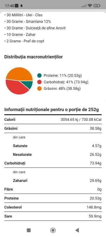 Valoare energetica/100g: 229,27 kcal/959,26 kJ, grasimi 12,51g, acizi grasi saturati 1,97g, glucide 24,13g, zaharuri 3,18g, proteine 4,31g, Sare 0,11g